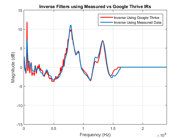 The differences between the two inverse filters can be seen below (again, I’m leveling off the response to account for YouTube rolling off after around 16kHz).